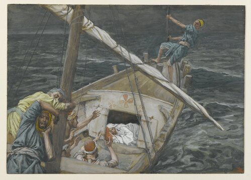 [1] See https://www.brooklynmuseum.org/opencollection/objects/4492. James Tissot (French, 1836-1902). Jesus Sleeping During the Tempest (Jésus dormant pendant la tempête) on Mark 4:35-41, 1886-1896. Opaque watercolor over graphite on gray wove paper, Image: 5 1/2 x 7 11/16 in. (14 x 19.5 cm). Brooklyn Museum, Purchased by public subscription, 00.159.101 (Photo: Brooklyn Museum, 00.159.101_PS2.jpg).