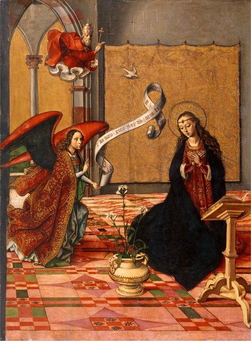 2 To zoom in on the painting for the sake of seeing it better, go to: https://commons.wikimedia.org/wiki/File:StaEulalia-Berruguete-Anunciacion.jpg.